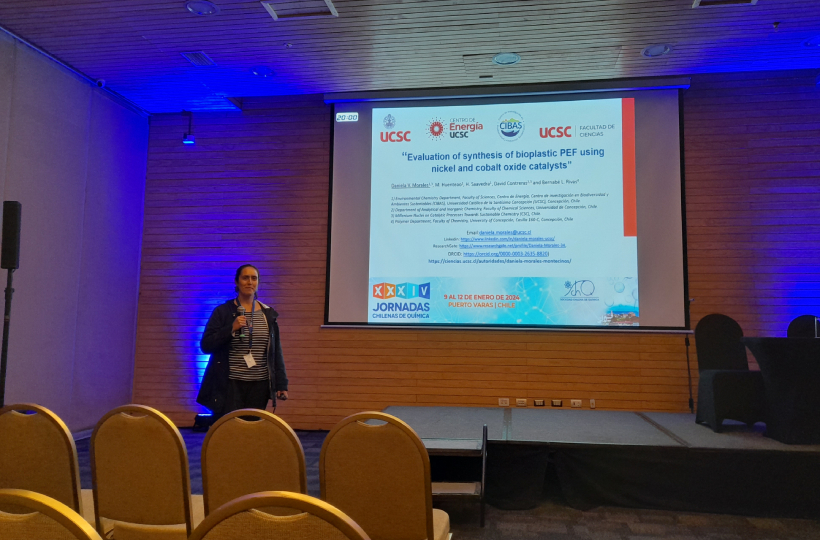 En particular, expuso sobre los resultados donde se estudió la evaluación de la síntesis de bioplástico PEF utilizando los catalizadores nanocompuestos de óxido de níquel y cobalto desarrollados para oxidar la molécula de 5-hidroximetilfurfural (HMF) a acido 2,5-dicarboxilico (FDCA) con el cual luego es posible obtener el bioplástico PEF, como una medida de valorización de residuos de pino radiata de la industria forestal de la región del Biobío.